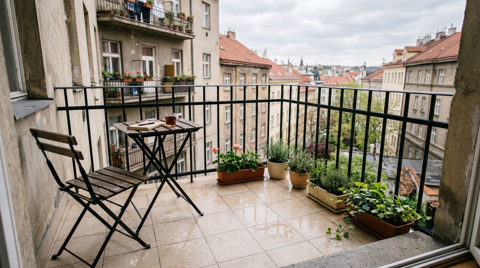 Jeden praktický tip z pražských domácností: mezi balkon a obývací pokoj si položte starý ručník nebo savou podložku. Zachytí vlhkost z bot i náhodné kapky z kbelíku. U panelákových balkonů je to skoro nutnost, jinak stačí pár cest tam a zpět a máte černé šlápoty po celém bytě.