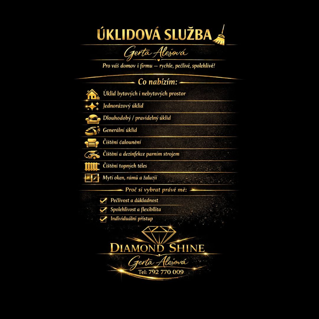 Máte špinavý gauč, koberec nebo okna? Vrátím vašemu domovu čistotu a svěžest čištění čalounění (gauče, koberce, matrace, auta), čištění a dezinfekce parním strojem, mytí oken bez šmouh, generální úklidy domácnosti, firmy i Airbnb, odstranění skvrn a zápachu, rychlé schnutí, spolehlivost a pečlivost. ✨ Nabídka 📍 Jihočeský kraj 💰 123456 Kč/úkol